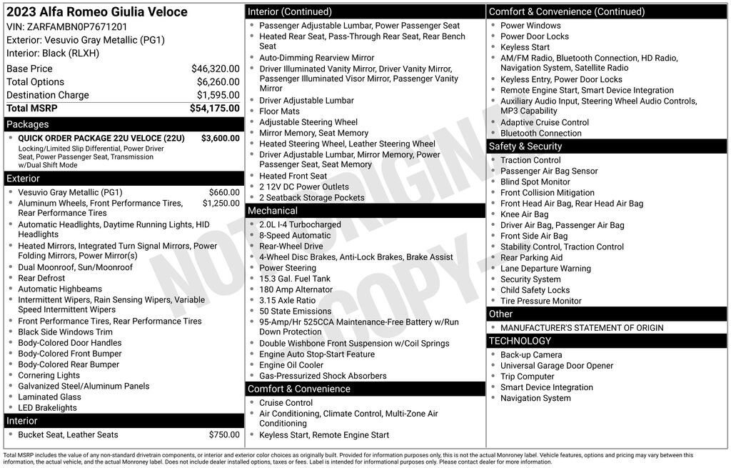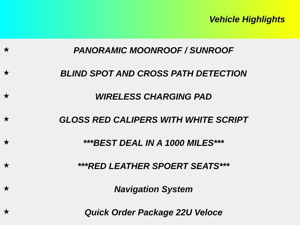 Recent Arrival! 2023 Alfa Romeo Giulia Veloce 1 OWNER, ADAPTIVE CRUISE CONTROL, APPLE CAR PLAY, ANDROID AUTO, GPS NAVIGATION, REMOTE START, TOUCH SCREEN DISPLAY, PUSH BUTTON START, KEYLESS ENTRY, HEATED FRONT SEATS, HEATED 2ND ROW SEATS, POWER LUMBAR ADJUSTABLE DRIVER SEAT, POWER DRIVER AND PASSENGER SEATS, BLUTOOTH, USB PORTS, AUXILLARY PORTS, PANORAMIC MOONROOF / SUNROOF, BLIND SPOT AND CROSS PATH DETECTION, WIRELESS CHARGING PAD, GLOSS RED CALIPERS WITH WHITE SCRIPT, ***BEST DEAL IN A 1000 MILES***, ***RED LEATHER SPOERT SEATS***, Giulia Veloce Ti, 4D Sedan, I4, 8-Speed Automatic, Vesuvio Gray Metallic, Black Leather, 8 Speakers, Aluminum Interior Trim, Aluminum Steering Column Mounted Paddle Shifters, AM/FM radio: SiriusXM, Auto-dimming Rear-View mirror, Automatic temperature control, Dark Miron V Scudetto Grille, Driver door bin, Driver vanity mirror, Four wheel independent suspension, Front dual zone A/C, Front reading lights, Garage door transmitter, Genuine wood console insert, Genuine wood dashboard insert, Genuine wood door panel insert, Heated front seats, Heated rear seats, Heated steering wheel, Illuminated entry, Leather Seats, Leather Shift Knob, Leather steering wheel, Limited Slip Differential Rear Axle, Manual Adjustable Thigh Support, Memory seat, Navigation System, Outside temperature display, Overhead console, Passenger vanity mirror, Power Adjust 8-Way Driver Seat, Power Adjustable Bolster, Power driver seat, Q2 Badge, Quick Order Package 22U Veloce, Radio: AM/FM/HD 8.8" w/Navigation, Rear reading lights, Rear seat center armrest, Remote keyless entry, Speed-sensing steering, Sport Leather Seats, Sport steering wheel, Steering wheel mounted audio controls, Tachometer, Telescoping steering wheel, Tilt steering wheel, Traction control, Veloce Rear Fascia, Wheels: 19" x 8.0" Fr & 19" x 9.0" Rr Sport 5-Hole, Wheels: 19" x 8.0" Sport 5-Hole Aluminum. CARFAX One-Owner. Vesuvio Gray Metallic