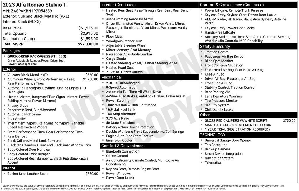 Recent Arrival! 2023 Alfa Romeo Stelvio Ti 1 OWNER, ADAPTIVE CRUISE CONTROL, APPLE CAR PLAY, ANDROID AUTO, GPS NAVIGATION, REMOTE START, PUSH BUTTON START, KEYLESS ENTRY, HEATED FRONT SEATS, HEATED STEERING WHEEL, ALL WHEEL DRIVE / AWD, TINTED WINDOWS, POWER LUMBAR ADJUSTABLE DRIVER SEAT, POWER DRIVER SEAT, POWER DRIVER AND PASSENGER SEATS, HEATED REAR SEATING, RAIN SENSING WIPERS, BLUTOOTH, PANORAMIC MOONROOF / SUNROOF, POWER MOONROOF / SUNROOF, HD RADIO, UNIVERSAL GARAGE DOOR OPENER, LEATHER SEATING, LANE DEPARTURE WARNING, BLIND SPOT WARNING, FORWARD COLLISION WARNING SYSTEM, FULL-SPEED FORWARD-COLLISION WARNING PLUS, PARKVIEW REAR BACK UP CAMERA, BLIND SPOT AND CROSS PATH DETECTION, ALUMINUM WHEELS, PREMIUM ALUMINUM WHEELS, STEERING WHEEL W/ AUDIO CONTROLS, DRIVER SEAT MEMORY, INTEGRATED VOICE COMMAND W/ BLUETOOTH, 3 MONTH FREE TRIAL SUBSCRIPTION SiriusXM SATELLITE RADIO, DEEP TINT SUNSCREEN (PRIVACY) GLASS, WIRELESS CHARGING PAD, CHOCOLATE LEATHER SEATING, 20 INCH SPORT 5-HOLE ALUMINUM WHEELS, DUAL DARK EXHAUST TIPS, AMBIENT LIGHTING PACKAGE, LED INTERIOR LIGHTING, Stelvio Ti, 4D Sport Utility, I4, 8-Speed Automatic, AWD, Vulcano Black Metallic, Black Leather, Brake assist, Electronic Stability Control, Four wheel independent suspension, Genuine wood console insert, Genuine wood dashboard insert, Genuine wood door panel insert, Illuminated entry, Memory seat, Navigation System, Power Adjust 6-Way Driver Seat, Power Adjust 6-Way Front Passenger Seat, Power Liftgate, Quick Order Package 22G Ti, Remote keyless entry, Silver Ti Badge, Speed-sensing steering, Traction control, Vesuvio Gray Body Kit, Wheels: 20" x 8.5" Sport 5-Hole Aluminum. CARFAX One-Owner. Vulcano Black Metallic