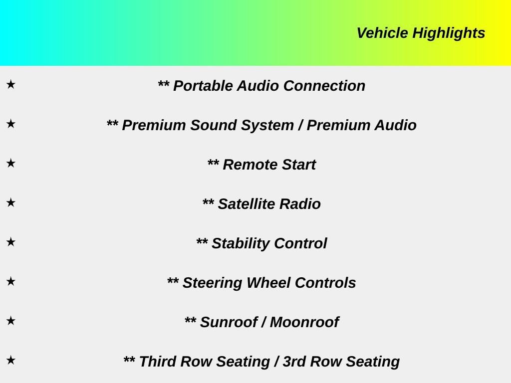 Entertainment package: premium sound system, rear seat audio controls, AM/FM/CD, satellite radio, auxiliary input