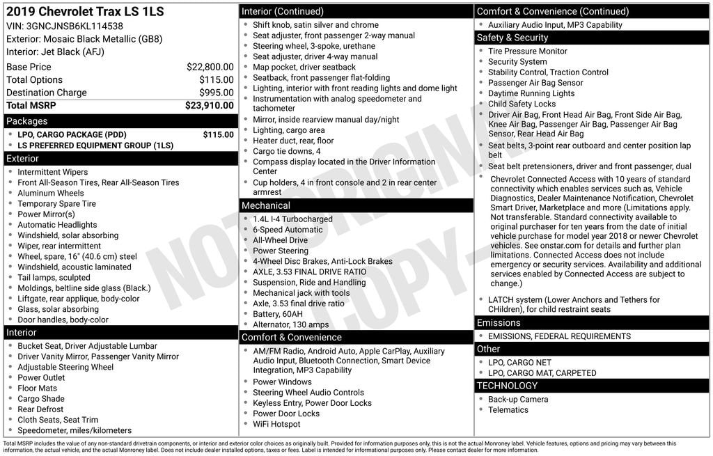 2019 Chevrolet Trax LS CLEAN CARFAX, APPLE CAR PLAY, ANDROID AUTO, KEYLESS ENTRY, ALL WHEEL DRIVE / AWD, POWER LUMBAR ADJUSTABLE DRIVER SEAT, BLUTOOTH, USB PORTS, AUXILLARY PORTS, LOCAL TRADE IN, ALUMINUM WHEELS, STEERING WHEEL W/ AUDIO CONTROLS, ALL MECHANICAL REPAIRS AND MAINTENANCE HAS BEEN PERFORMED AND IS READY FOR IMMEDIATE DELIVERY!, BRAND NEW TIRES, REAR BACK UP CAMERA, WIFI HOTSPOT, Trax LS, 4D Sport Utility, ECOTEC 1.4L I4 SMPI DOHC Turbocharged VVT, 6-Speed Automatic, AWD, Mosaic Black Metallic, Black Cloth, 16" Aluminum Wheels, 2 USB Ports w/Auxiliary Input Jack, 4-Way Manual Driver Seat Adjuster, Air Conditioning, All-Wheel Drive Chassis, Apple CarPlay/Android Auto, Brake assist, Compass, Delay-off headlights, Driver door bin, Driver vanity mirror, Driver's Seat Mounted Armrest, Electronic Stability Control, Front Bucket Seats, Front Bucket Seats w/Driver Power Lumbar, Front reading lights, Fully automatic headlights, Illuminated entry, Outside temperature display, Panic alarm, Passenger vanity mirror, Power windows, Preferred Equipment Group 1LS, Premium audio system: Chevrolet MyLink, Rear seat center armrest, Rear window wiper, Remote keyless entry, Security system, Speed-sensing steering, Split folding rear seat, Tachometer, Telescoping steering wheel, Tilt steering wheel, Traction control, Trip computer, Variably intermittent wipers. Clean CARFAX. Mosaic Black Metallic