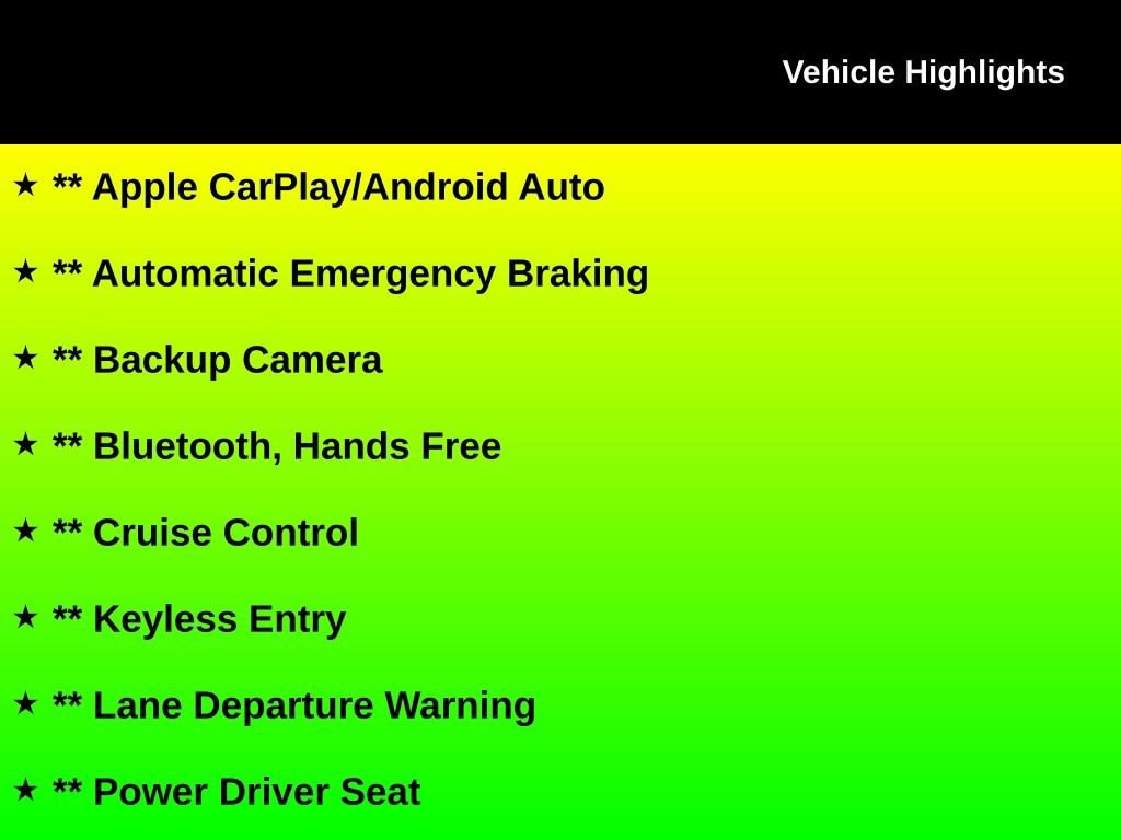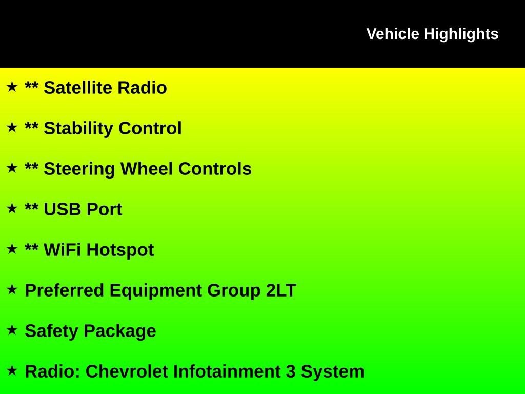 ** Apple CarPlay/Android Auto, ** Automatic Emergency Braking, ** Backup Camera, ** Bluetooth, Hands Free, ** Cruise Control, ** Keyless Entry, ** Lane Departure Warning, ** Power Driver Seat, ** Satellite Radio, ** Stability Control, ** Steering Wheel Controls, ** USB Port, ** WiFi Hotspot, Colorado LT, 2.5L I4 DI DOHC VVT, 6-Speed Automatic, RWD, Black, Black Cloth, 6-Speaker Audio System Feature, Auto-dimming Rear-View mirror, Forward Collision Alert, Preferred Equipment Group 2LT, Radio: Chevrolet Infotainment 3 System, Safety Package, SiriusXM Radio.