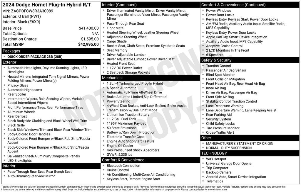 2024 Dodge Hornet R/T EAWD 1 OWNER, ADAPTIVE CRUISE CONTROL, APPLE CAR PLAY, ANDROID AUTO, REMOTE START, UCONNECT 5 w/ 10.25 - INCH TOUCH SCREEN DISPLAY, TOUCH SCREEN DISPLAY, PUSH BUTTON START, KEYLESS ENTRY, HEATED FRONT SEATS, HEATED STEERING WHEEL, ALL WHEEL DRIVE / AWD, TINTED WINDOWS, POWER LUMBAR ADJUSTABLE DRIVER SEAT, POWER DRIVER SEAT, RAIN SENSING WIPERS, BLUTOOTH, USB PORTS, AUXILLARY PORTS, HD RADIO, UNIVERSAL GARAGE DOOR OPENER, LANE DEPARTURE WARNING, LANE KEEPING ASSISTANCE WARNING, BLIND SPOT WARNING, FORWARD COLLISION WARNING SYSTEM, PARKVIEW REAR BACK UP CAMERA, BLIND SPOT AND CROSS PATH DETECTION, PEDESTRIAN/ CYCLIST EMERGENCY BRAKING, ALUMINUM WHEELS, DRIVER SEAT MEMORY, INTEGRATED VOICE COMMAND W/ BLUETOOTH, BALANCE OF FACTORY POWERTRAIN WARRANTY, DEEP TINT SUNSCREEN (PRIVACY) GLASS, BRAND NEW TIRES, REAR BACK UP CAMERA, FULL-SPEED FORWARD - COLLISION WARNING PLUS, UCONNECT 5 w/ 10.25- INCH TOUCH SCREEN DISPLAY, Electrified muscle meets modern sophistication in the 2024 Dodge Hornet R/T EAWD a plug-in hybrid SUV that redefines what it means to drive bold. With its aggressive stance, muscular lines, and unmistakable Dodge DNA, this Hornet R/T is not just a vehicle it's a statement. Plug it in, punch it, and own the road with up to 288 horsepower and 383 lb-ft of torque that delivers instant acceleration and commanding control in all conditions. This is Dodges first performance hybrid SUV, and it shows. The R/T trim is engineered with precision, blending an advanced 1.3L turbocharged engine with an electric motor for a thrilling drive that still earns an EPA-estimated 32 miles of all-electric range. When combined, you get not just great mileage, but the freedom to commute in pure EV mode or unleash the full power when the road calls for it. The PowerShot feature adds a jaw-dropping 30-horsepower burst on demand 0-60 in just 5.6 seconds. Equipped with Electronic All-Wheel Drive (EAWD), the 2024 Hornet R/T maintains maximum grip and control, whether it's tight city corners or winding country roads. Behind the wheel, the Hornet surrounds you with cutting-edge tech: a 12.3-inch digital cluster, 10.25-inch Uconnect 5 touchscreen, wireless Apple CarPlay/Android Auto, and available Harman Kardon premium audio to heighten every drive. Safety comes standard with Automatic Emergency Braking, Blind Spot Monitoring, Rear Cross Path Detection, Lane Keep Assist, and a High Beam Assist system. Dodge has packed this compact performance SUV with high-level safety, earning praise for its intelligent driver-assistance features and solid crash safety structure., Hornet R/T EAWD, 4D Sport Utility, 1.3L I4, 6-Speed Automatic, AWD, Q Ball (White), Black w/Cloth/Leatherette Seats or Alcantara Seats w/Red Accents or Leather Seats or Red Leather Seats, 10.25" Touchscreen Display, 4-Wheel Disc Brakes, 6 Speakers, ABS brakes, Air Conditioning, AM/FM radio: SiriusXM, Anti-whiplash front head restraints, Apple CarPlay, Apple CarPlay/Android Auto, Auto High-beam Headlights, Auto-dimming Rear-View mirror, Brake assist, Bumpers: body-color, Cloth/Leatherette Seats, Compass, Connectivity - US/Canada, Delay-off headlights, Disassociated Touchscreen Display, Driver door bin, Driver Seat Memory, Driver vanity mirror, Dual front impact airbags, Dual front side impact airbags, Electronic Stability Control, Emergency communication system: Dodge Connect, Four wheel independent suspension, Front Bucket Seats, Front Center Armrest w/Storage, Front reading lights, Fully automatic headlights, Garage door transmitter, Google Android Auto, GPS Antenna Input, Heated door mirrors, Heated front seats, Heated steering wheel, Illuminated entry, Knee airbag, Lane Departure Warning System, Leather Shift Knob, Leather steering wheel, Low tire pressure warning, Memory seat, Normal Duty Suspension, Occupant sensing airbag, Outside temperature display, Overhead airbag, Overhead console, Panic alarm, ParkView Rear Back-Up Camera, Passenger door bin, Passenger vanit