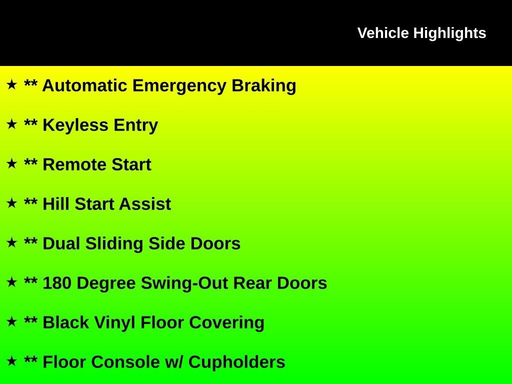 ** Automatic Emergency Braking, ** Keyless Entry, ** Remote Start, ** Hill Start Assist, ** Dual Sliding Side Doors, ** 180 Degree Swing-Out Rear Doors, ** Black Vinyl Floor Covering, ** Floor Console w/ Cupholders, ** Overhead Storage Shelf, Transit Connect XL, 4D Cargo Van, Duratec 2.5L I4, 6-Speed Automatic with Select-Shift, FWD, Frozen White, Pewter Vinyl, AM/FM radio, Order Code 100A.