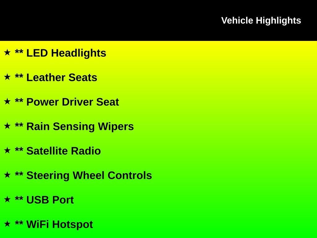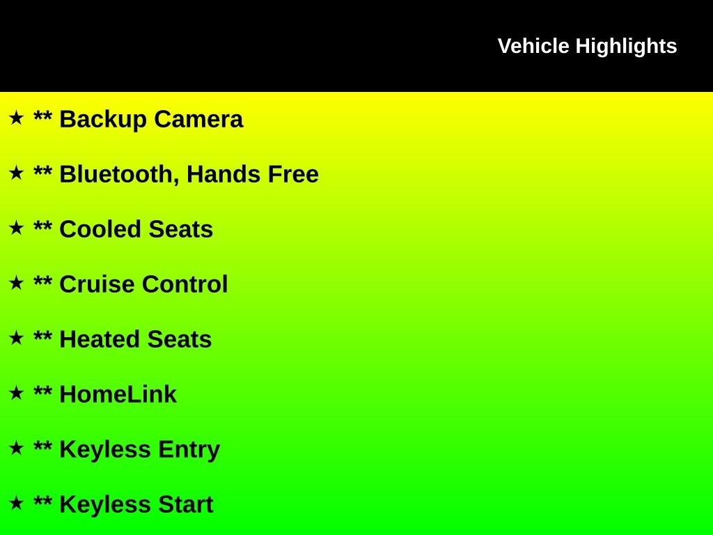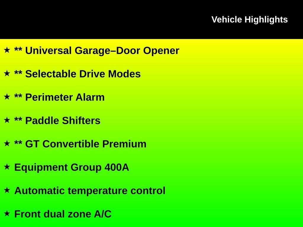 ** Backup Camera, ** Bluetooth, Hands Free, ** Cooled Seats, ** Cruise Control, ** Heated Seats, ** HomeLink, ** Keyless Entry, ** Keyless Start, ** LED Headlights, ** Leather Seats, ** Power Driver Seat, ** Rain Sensing Wipers, ** Satellite Radio, ** Steering Wheel Controls, ** USB Port, ** WiFi Hotspot, ** Universal Garage Door Opener, ** Selectable Drive Modes, ** Perimeter Alarm, ** Paddle Shifters, ** GT Convertible Premium, Mustang GT Premium, 2D Convertible, 5.0L V8 Ti-VCT, 10-Speed Automatic, RWD, Shadow Black, Ebony Leather, Auto-dimming Rear-View mirror, Automatic temperature control, Climate Controlled Heated/Cooled Front Seats, Convertible roof lining, Driver vanity mirror, Equipment Group 400A, Four wheel independent suspension, Front dual zone A/C, Front fog lights, Fully automatic headlights, Heated door mirrors, Leather-Trimmed Bucket Seats, Overhead console, Panic alarm, Passenger vanity mirror, Power convertible roof, Power door mirrors, Rear Parking Sensors, Security system, Traction control, Wheels: 18" x 8" Machined-Face Aluminum.