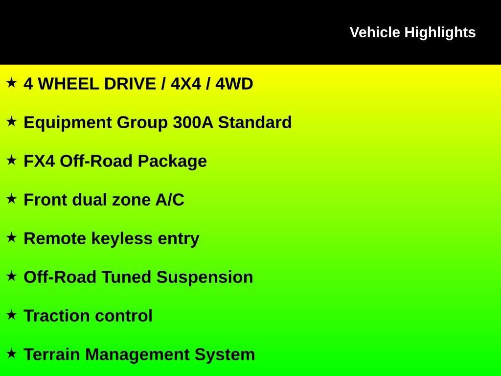 4 WHEEL DRIVE / 4X4 / 4WD, 4D Crew Cab, EcoBoost 2.3L I4 GTDi DOHC Turbocharged VCT, 10-Speed Automatic, 4WD, ABS brakes, Alloy wheels, Compass, Electronic Stability Control, Electronic-Locking Rear Differential, Equipment Group 300A Standard, Front dual zone A/C, FX4 Off-Road Box Decal, FX4 Off-Road Package, Illuminated entry, Low tire pressure warning, Off-Road Screen in Cluster, Off-Road Tuned Suspension, Remote keyless entry, Terrain Management System, Traction control.