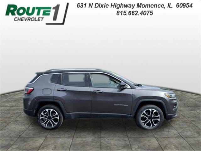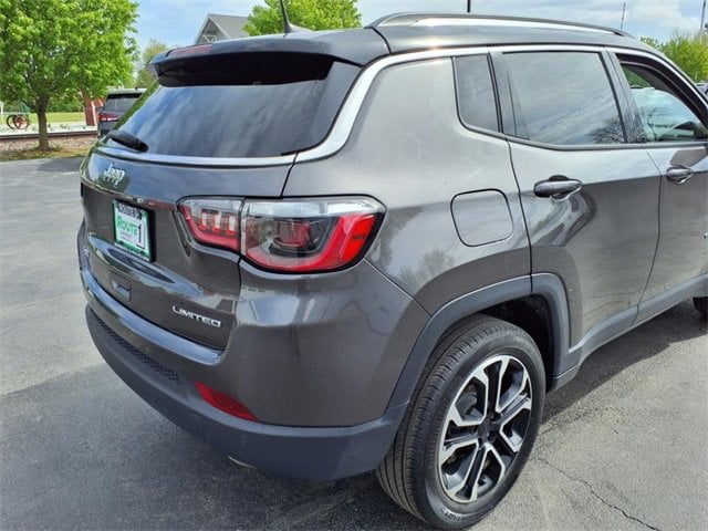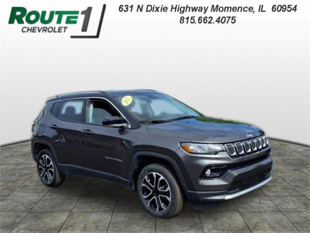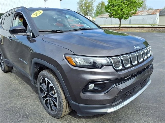 Granite Crystal Metallic Clearcoat 2022 Jeep Compass Limited 4WD 9-Speed 948TE Automatic 2.4L I4 4WD, 10.1 Touchscreen Display, 3.73 Axle Ratio, 4-Wheel Disc Brakes, 6 Speakers, ABS brakes, Air Conditioning, Alloy wheels, AM/FM radio: SiriusXM, Anti-whiplash front head restraints, Auto High-beam Headlights, Auto-dimming Rear-View mirror, Automatic temperature control, Brake assist, Bumpers: body-color, Compass, Delay-off headlights, Disassociated Touchscreen Display, Driver door bin, Driver vanity mirror, Dual front impact airbags, Dual front side impact airbags, Electronic Stability Control, Emergency communication system: SiriusXM Guardian, Four wheel independent suspension, Front anti-roll bar, Front Bucket Seats, Front Center Armrest w/Storage, Front dual zone A/C, Front fog lights, Front reading lights, Fully automatic headlights, Global Telematics Box Module (TBM), Gloss Black Exterior Mirrors, Heated door mirrors, Heated front seats, Heated steering wheel, Illuminated entry, Knee airbag, Leather Shift Knob, Leather Trimmed Bucket Seats, Low tire pressure warning, Occupant sensing airbag, Outside temperature display, Overhead airbag, Overhead console, Panic alarm, ParkView Rear Back-Up Camera, Passenger door bin, Passenger vanity mirror, Power door mirrors, Power driver seat, Power steering, Power windows, Quick Order Package 2GG, Radio: Uconnect 5 w/10.1 Display, Rain sensing wipers, Rear anti-roll bar, Rear seat center armrest, Rear window defroster, Rear window wiper, Remote keyless entry, Roof rack: rails only, Security system, Speed control, Split folding rear seat, Spoiler, Steering wheel mounted audio controls, Tachometer, Telescoping steering wheel, Tilt steering wheel, Traction control, Trip computer, Turn signal indicator mirrors, Variably intermittent wipers, Wheels: 18 x 7 Painted Diamond Cut Aluminum.