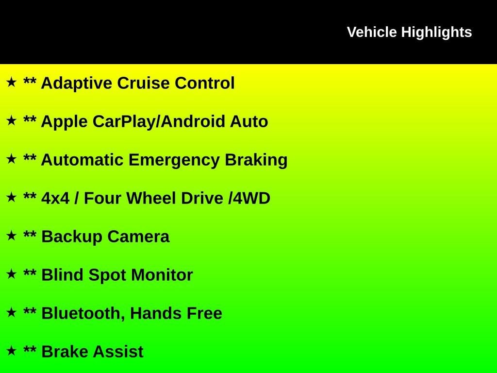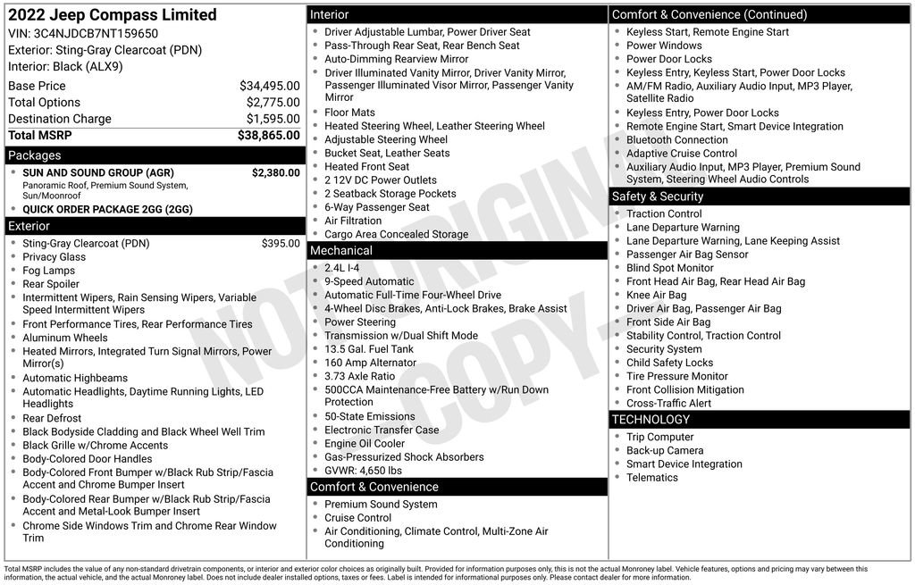 ** Adaptive Cruise Control, ** Apple CarPlay/Android Auto, ** Automatic Emergency Braking, ** 4x4 / Four Wheel Drive /4WD, ** Backup Camera, ** Blind Spot Monitor, ** Bluetooth, Hands Free, ** Brake Assist, ** Cross Traffic Alert, ** Cruise Control, ** Heated Seats, ** Heated Steering Wheel, ** Keyless Entry, ** Keyless Start, ** LED Headlights, ** Lane Departure Warning, ** Leather Seats, ** Panoramic Roof / Sunroof, ** Power Driver Seat, ** Rain Sensing Wipers, ** Remote Start, ** Stability Control, ** Steering Wheel Controls, ** USB Port, AUXILLARY PORTS, Compass Limited, 4D Sport Utility, 2.4L I4, 9-Speed 948TE Automatic, 4WD, Sting-Gray Clearcoat, Black Leather, 10.1" Touchscreen Display, Auto High-beam Headlights, Auto-dimming Rear-View mirror, Automatic temperature control, Front dual zone A/C, Fully automatic headlights, Heated door mirrors, Power Front/Fixed Rear Full Sunroof, Premium Alpine Speaker System, Quick Order Package 2GG, Sun and Sound Group, Turn signal indicator mirrors, Wheels: 18" x 7" Painted Diamond Cut Aluminum.