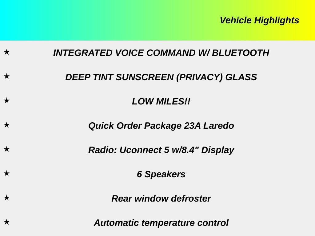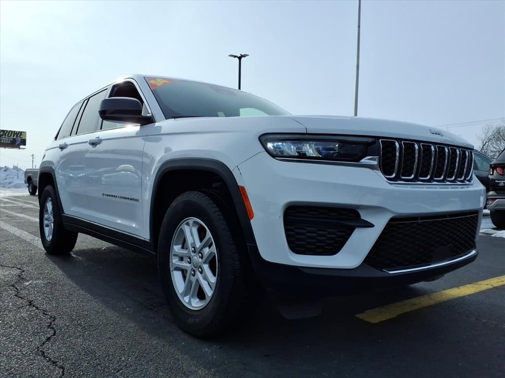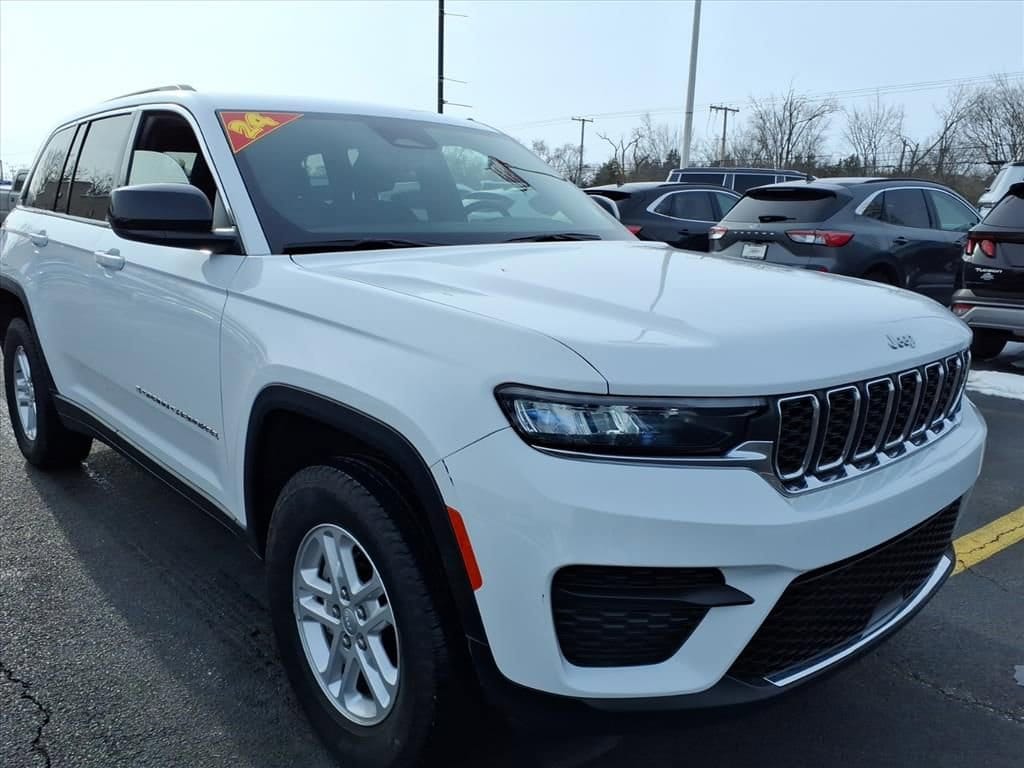 Recent Arrival! 2024 Jeep Grand Cherokee Laredo 1 OWNER, ADAPTIVE CRUISE CONTROL, APPLE CAR PLAY, ANDROID AUTO, UCONNECT 4 w/ 8.4-INCH TOUCH SCREEN DISPLAY, PUSH BUTTON START, 8-WAY POWER DRIVER SEAT, BLUTOOTH, USB PORTS, ACTIVE LANE-MANAGEMENT SYSTEM, FULL-SPEED FORWARD-COLLISION WARNING PLUS, PARKVIEW REAR BACK UP CAMERA, PARKSENSE REAR PARK-ASSIST W/ STOP, BLIND SPOT AND CROSS PATH DETECTION, ALUMINUM WHEELS, STEERING WHEEL W/ AUDIO CONTROLS, INTEGRATED VOICE COMMAND W/ BLUETOOTH, DEEP TINT SUNSCREEN (PRIVACY) GLASS, LOW MILES!!, Grand Cherokee Laredo, 4D Sport Utility, 3.6L V6 24V VVT, 8-Speed Automatic, 4WD, Bright White Clearcoat, Black Cloth, 6 Speakers, Automatic temperature control, Brake assist, Delay-off headlights, Electronic Stability Control, Four wheel independent suspension, Front Bucket Seats, Front Center Armrest w/Storage, Fully automatic headlights, Heated door mirrors, Normal Duty Suspension, Panic alarm, Power door mirrors, Power driver seat, Quick Order Package 23A Laredo, Radio: Uconnect 5 w/8.4" Display, Rear window defroster, Remote keyless entry, Security system, Speed-Sensitive Wipers, Split folding rear seat, Steering wheel mounted audio controls, Traction control, Variably intermittent wipers, Wheels: 17" x 6.5" Fully Painted Aluminum. CARFAX One-Owner. Bright White Clearcoat