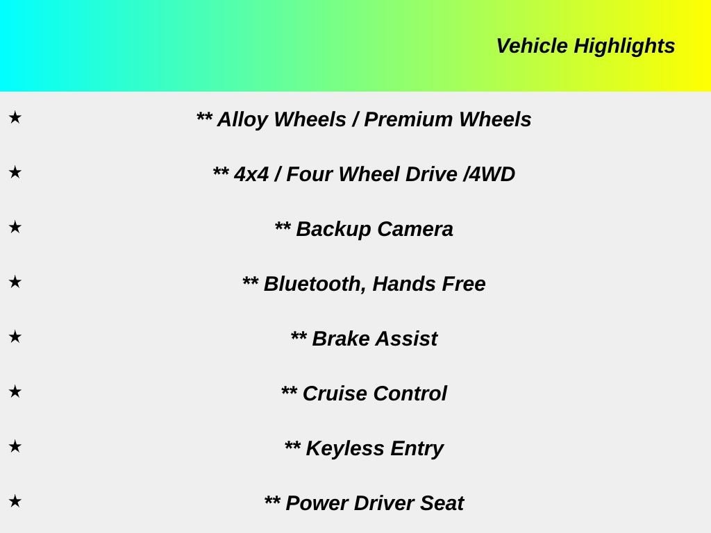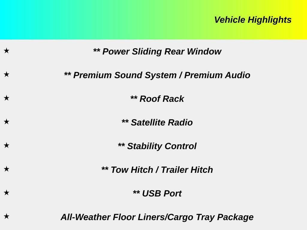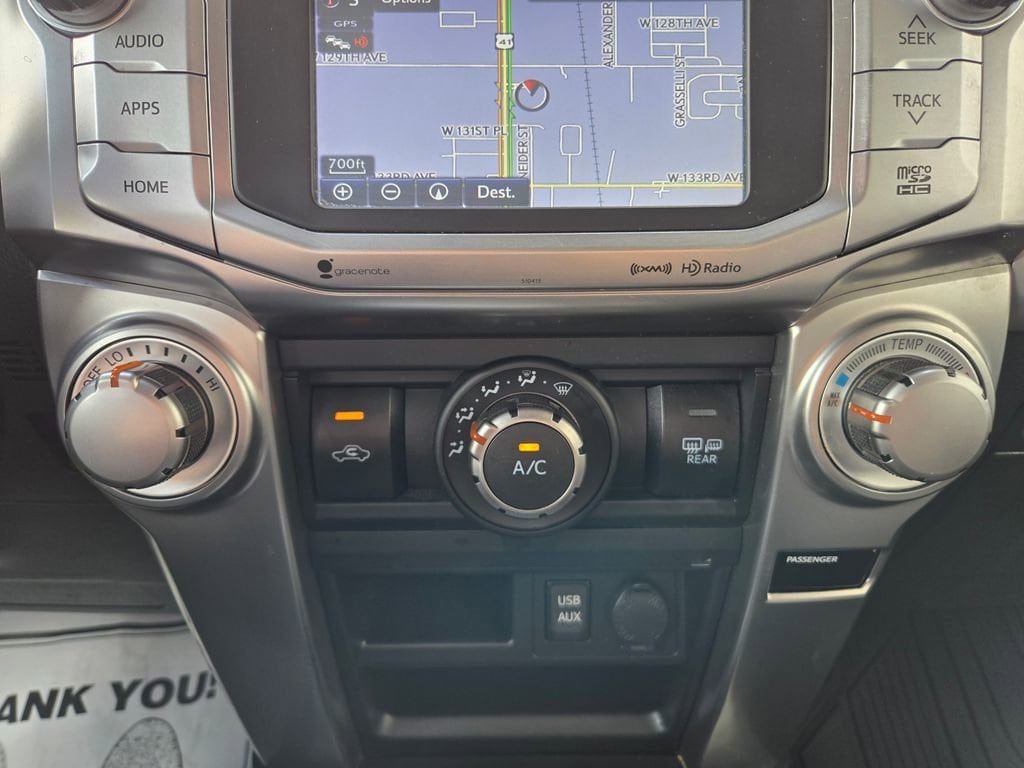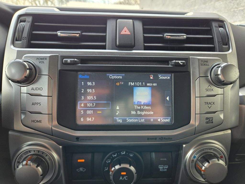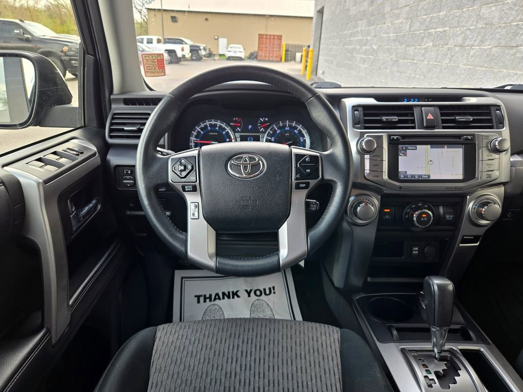 ** Alloy Wheels / Premium Wheels, ** 4x4 / Four Wheel Drive /4WD, ** Backup Camera, ** Bluetooth, Hands Free, ** Brake Assist, ** Cruise Control, ** Keyless Entry, ** Power Driver Seat, ** Power Sliding Rear Window, ** Premium Sound System / Premium Audio, ** Roof Rack, ** Satellite Radio, ** Stability Control, ** Tow Hitch / Trailer Hitch, ** USB Port, 4Runner SR5, 4D Sport Utility, 4.0L V6 SMPI DOHC, 5-Speed Automatic with Overdrive, 4WD, Midnight Black Metallic, Graphite Cloth, 17" x 7.0" 6-Spoke Alloy Wheels, All-Weather Floor Liners/Cargo Tray Package, CD player, Front fog lights, Radio: Entune Premium Audio with Navigation.