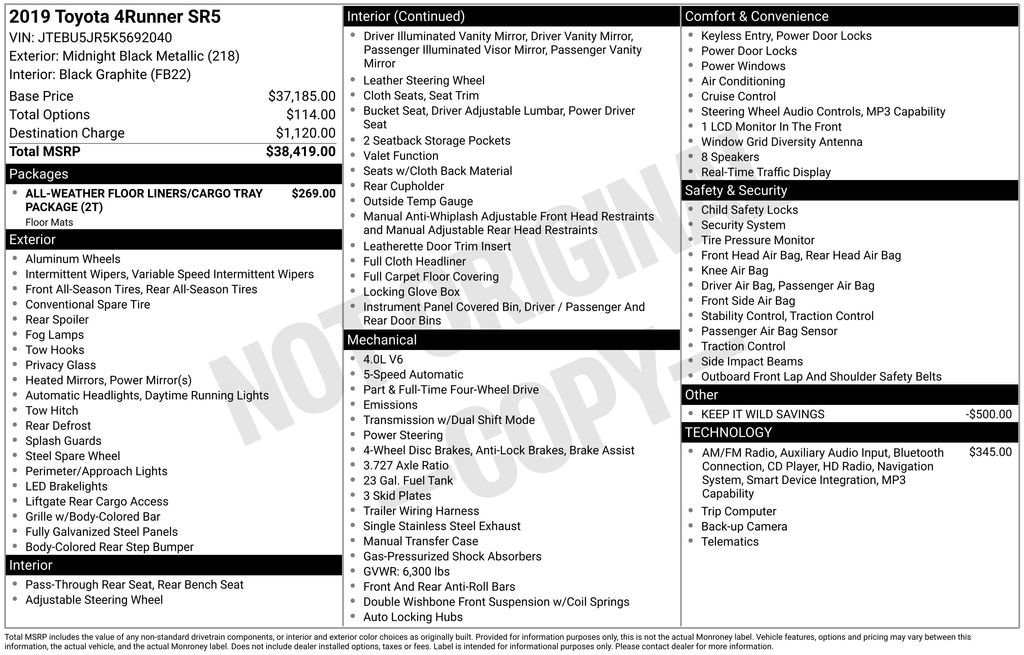 Midnight Black Metallic 2019 Toyota 4Runner 4D Sport Utility SR5 4.0L V6 SMPI DOHC 17/20 City/Highway MPG 5-Speed Automatic with Overdrive 4WD